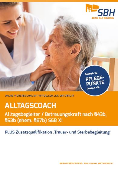 Unsere Weiterbildung im Bereich der Alltagsbegleitung / Alltagsassistenz  eröffnet Ihnen neue Chancen und Perspektiven als qualifizierte Betreuungskraft in Senioren- und Pflegeeinrichtungen tätig zu werden. Dabei können Sie nach erfolgreichem Absolvieren den Nachweis gem. §§ 43b und 53b SGB XI für zusätzliche Betreuungskräfte erhalten. Zudem erlangen Sie weitgehende Fähigkeiten im Bereich der Sterbe- und Trauerbegleitung von Patient*innen und Angehörigen.